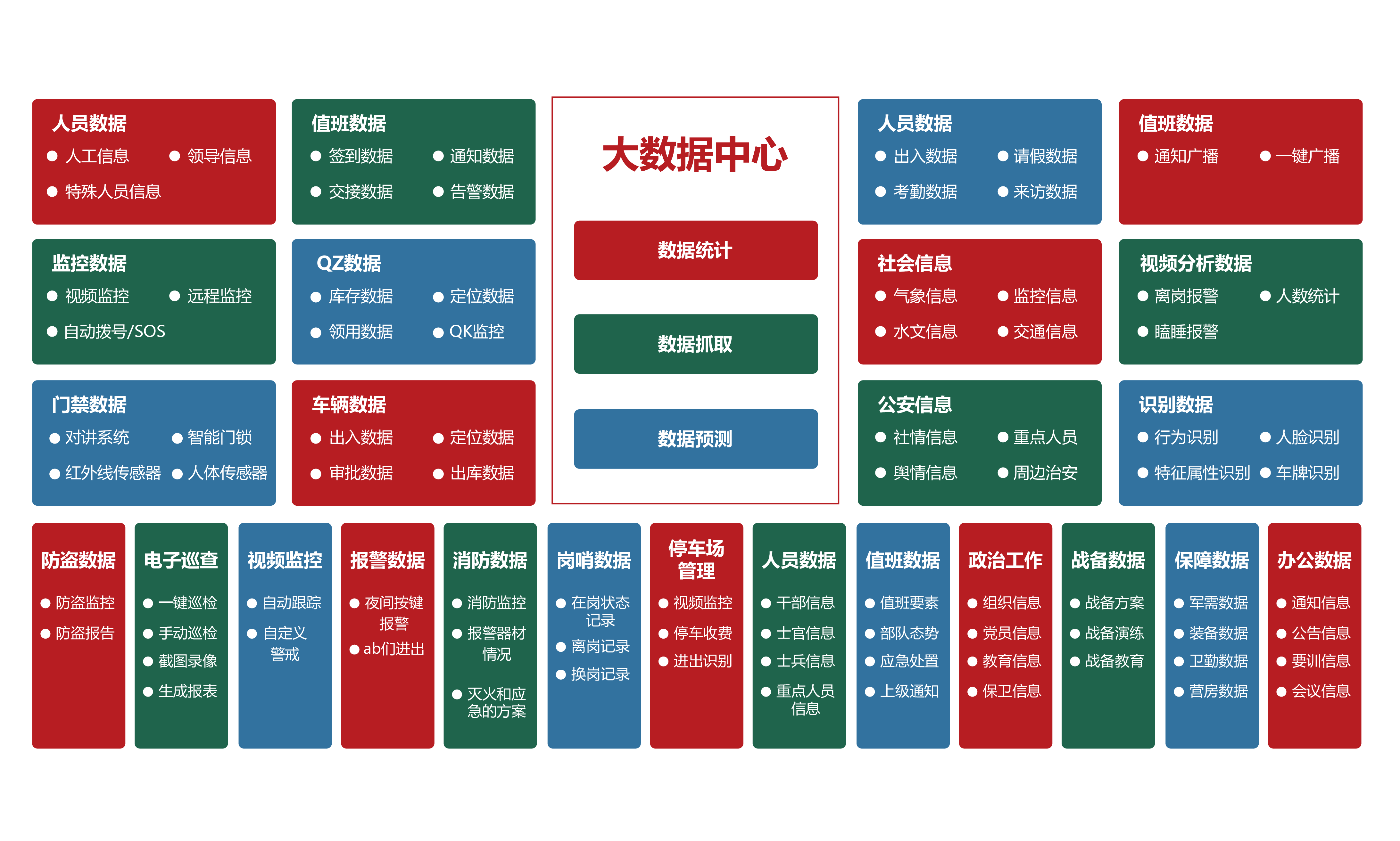 部隊管理系統基于對營區內人、車、dy、崗哨等建設要求,結合軍隊自身特點及應用現狀,實現網絡化管理,提高人、車等管理的效率。可以提高響應能力,構建人、車、q、d、密的全方位綜合管理的部隊系統,保障整體系統高效、穩定、安全運行,提升部隊全面信息化建設層次